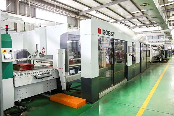 ![]() | 公司拥有从德国引进的先进瓦楞纸板生产流水线和从法国引进的五色柔印制箱联动线,使生产自动化控制得到全面、有效的提高。德国BHS卓越之星五层瓦楞纸板生产线,设计最高时速300米/分,年产能可达1亿平方米。该流水线采用了国际最先进的生产工艺,智能化程度极高,配备QDM,能够记忆和调取订单生产资料,确保稳定运行;同时瓦楞辊采用卡夹安装以及周边加热方式,调换瓦楞辊最快15分钟,大大提高换瓦楞效率。法国BOBST(博斯特)FFG 8.20全自动纸箱联动线,生产速度可达24000个纸箱/小时,只需3人就能轻松操作机器,是国内首条该型号纸箱联动生产线。整条线具有快速设置功能,只需1~2分钟即可完成换单,能超高效生产规则开槽箱,具有SOC功能(前单完成后单自动到位)、五色印刷、自动印刷纠错等功能。 |